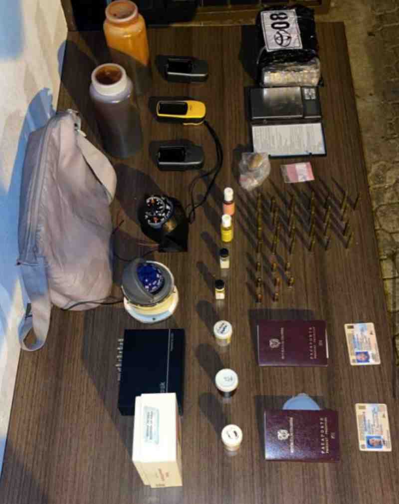 Durante el operativo, las autoridades confiscaron una bolsa que contenía un polvo blanco, presumiblemente cocaína, dos paquetes de otras sustancias controladas, 25 cápsulas calibre 5.56, ocho proyectiles calibre 9 mm, una balanza, dos brújulas, cuatro dispositivos GPS, dos pasaportes y un DVR.